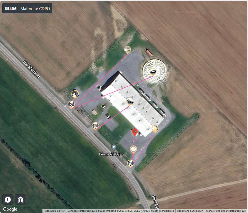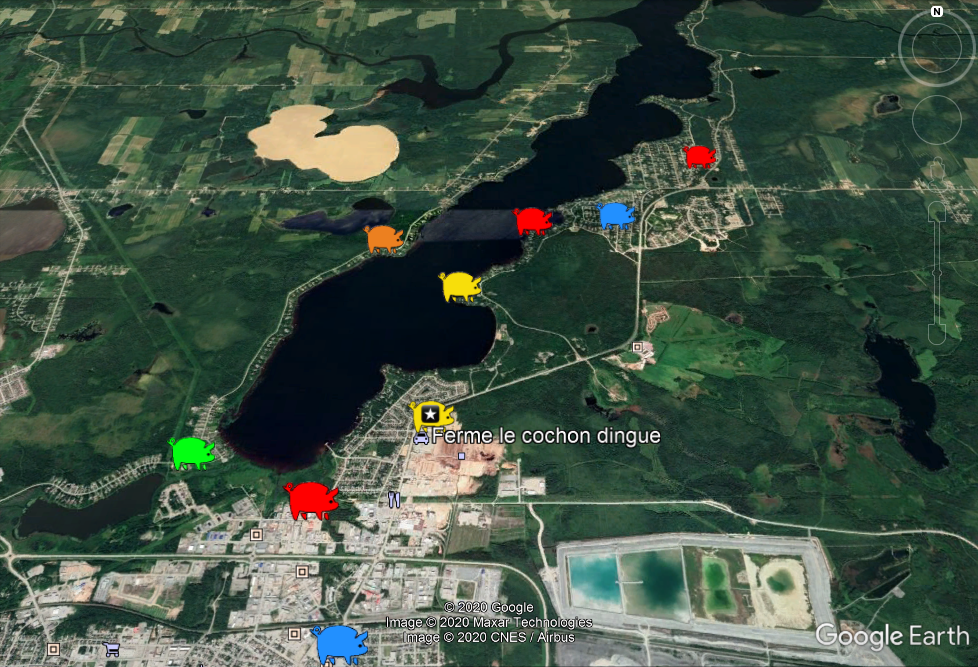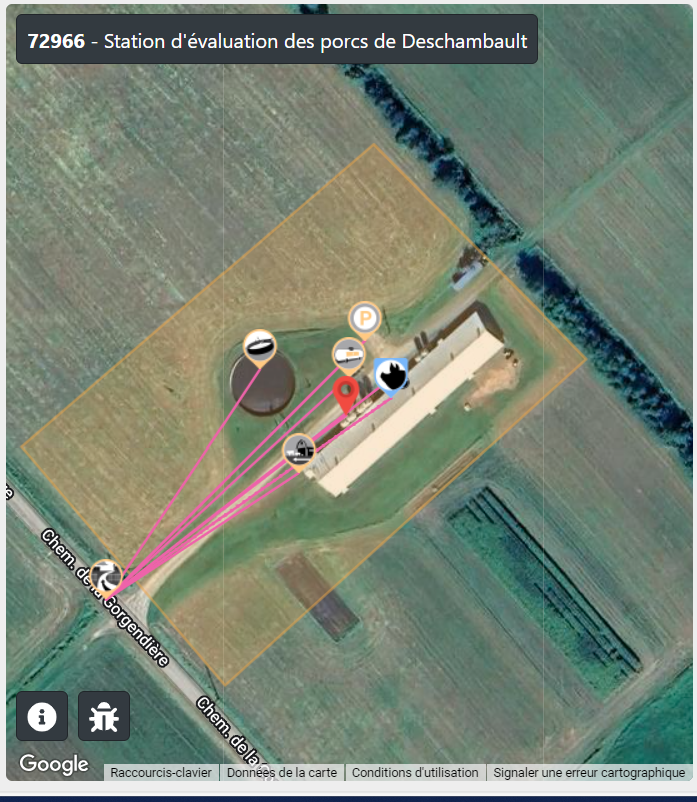Pour chaque site de prodcution porcine du Québec, le CDPQ a défini une Zone d'accès contrôlée par défaut. Cette zone peut-être redéfinie par l'outil GEOLOC.